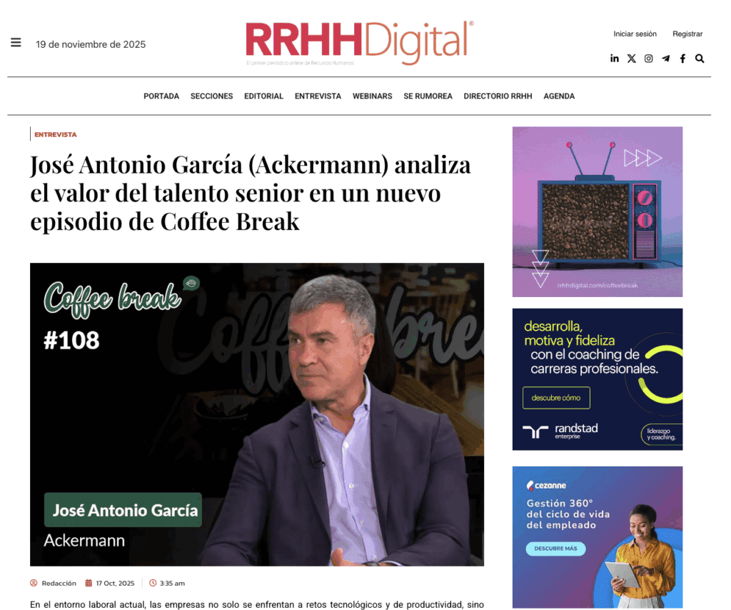Jose Antonio García Martín, Senior Partner de Ackermann, fue entrevistado en el programa Coffee Break de RRHHDigital sobre el impacto que está teniendo la jubilación y prejubilación de la generación del baby boom y el papel determinante que juega la planificación de estas sucesiones en las organizaciones.