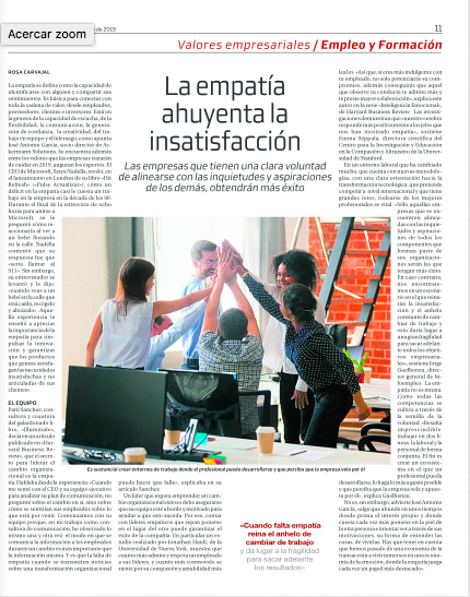 “Más allá de la definición popular de empatía, me gustaría destacar que la empatía es una cualidad o habilidad fundamental en el plano social y también en el laboral ya que es fundamental para conseguir conectar y relacionarnos con los demás. Hemos de tener en cuenta que hemos pasado de una economía de la transacción (marcada por la compra de productos y servicios) a vivir inmersos en una economía de la emoción (marcada por las experiencias de uso, y la creación de comunidades y fans de una marca), donde la generación de la relación y la lealtad se convierte en factor critico de éxito. Asimismo, hemos evolucionado desde el mundo de lo complicado al mundo de lo complejo. En el mundo de lo complicado, los problemas tenían una solución predecible y única, bastaba con descubrirla, sistematizarla, procedimentarla, y aplicarla . En el mundo de lo complejo, los problemas son impredecibles porque en ellos intervienen múltiples variables; las soluciones son abiertasy requieren, por tanto, de grandes dosis de creatividad y de talento. Ambas circunstancias nos colocan en un escenario absolutamente relacional y colaborativo, donde el individualismo no tiene cabida y la fuerza radica en la cooperación, el trabajo en equipo, la suma de ideas y perspectivas. Y es por ello que la empatía cobra gran relevancia”.